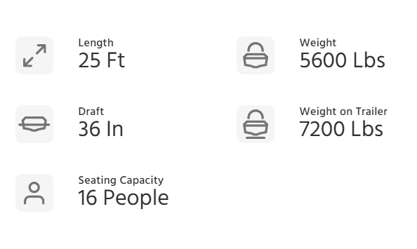 More space for more fun. The Fe25 has generous seating room and all the performance of the smaller Fes. If you like extra space and extra touches, the 25-foot Fe25 is the boat that will appeal to you. It is as responsive as the other Fes even though it offers more room for you and all your gear. The Fe25 is for your large family or group and all-day fun on the water. Even with 16 people it won’t feel crowded, thanks to the exceptional storage throughout.