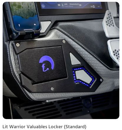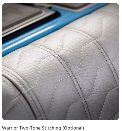 Gel Coat Scheme: Drive | Package: Warrior | Hull Main Front: Black Metal Flake | Hull Accent: Charcoal | Deck Base: White Frost | Hull Base: Charcoal | Swim Step: Black Metal Flake | Tower: Predator Power Tower | Tower Color: White | Tower Accent: Black Metal Flake | Colored Aluminum Accents: White Frost | Upholstery Scheme: Hex Accent with Cool Touch | Upholstery Main: Onyx Black | Upholstery Base: Charcoal | Upholstery Accent: Onyx Black | Upholstery Accent 2: White Frost | Upholstery Welt: White Frost | Stitching Scheme: Warrior Two-Tone Stitching | Stitching Accent: White | Warrior Two-Tone Stitching Accent Color 2: Medium Gray | Dash Accent: Charcoal | Interior Side Panel: Black Metal Flake | Gator Step Flooring Scheme: 3-Color Warrior Cut w/ Laser | 1st Color Top: GS Shark Fin | 2nd Color Middle: GS Silver Cloud | 3rd Color Bottom: GS Black | Gator Step Laser Texture: Gator Step Laser Camo | Stereo: Centurion SurroundFire by Roswell | Speaker Color: Black